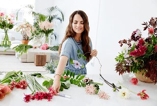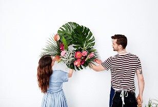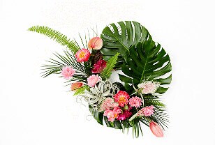 “For this arrangement, my inspiration came from juicy summer peaches and watermelons,” says Kristen. She used anthurium, peonies and dahlias in bright, cheery shades of melon and pink, which really pop against the wreath of vibrant green monstera leaves. “I love to incorporate greenery and fresh herbs into my arrangements, I’ll even forage for them myself while hiking in my neighborhood,” says Kristen. “Nothing should ever be too perfect or precious. I like it when things are a little asymmetrical and wild,” she says.